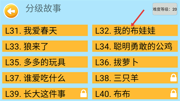 2、在分級故事頁面點擊【L32-我的布娃娃】,進入該故事的學(xué)習(xí)頁面。