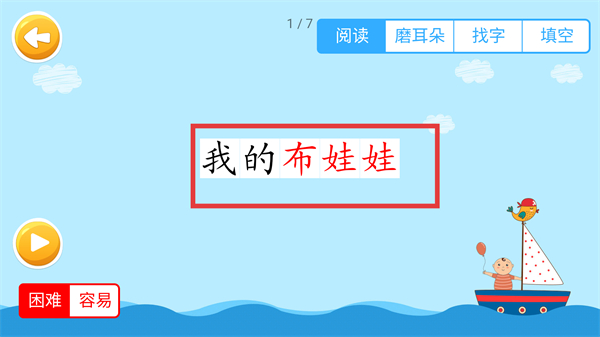 3、在故事學(xué)習(xí)頁面,可在【閱讀】模式下查看“我的布娃娃”故事內(nèi)容,還可切換磨耳朵、找字、填空等模式。