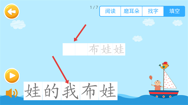 4、切換到【填空】模式,將“我”字填入空格,完成“我的布娃娃”的填空練習(xí),提升識字與語句理解能力。