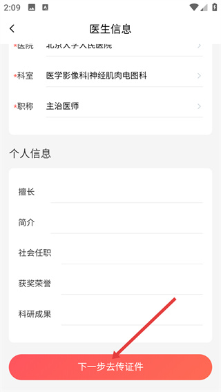 3、完成賬號(hào)登錄進(jìn)入醫(yī)生信息頁(yè),填寫【醫(yī)院】【科室】【職稱】等必填項(xiàng),補(bǔ)充個(gè)人信息后點(diǎn)擊【下一步去傳證件】。