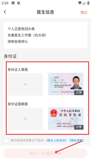 4、在證件上傳頁(yè),按要求準(zhǔn)備【個(gè)人正面免冠工作服頭像】【身份證人像面】【國(guó)徽面】。上傳證件后勾選協(xié)議,點(diǎn)擊【最后一步,提交審核】,完成醫(yī)生入駐流程。