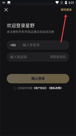 2、在登錄頁面點(diǎn)擊右上角【密碼登錄】,切換到密碼登錄模式。