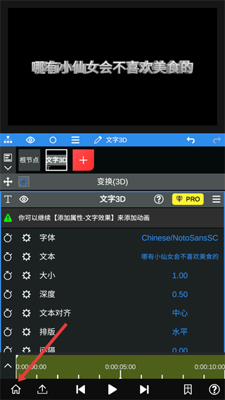 4、在文字3D編輯界面設(shè)置字體、文本、大小等參數(shù),完成后可點擊底部首頁圖標返回。