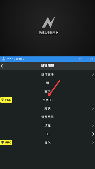 3、在新建圖層列表中選擇【文字3D】,進入文字3D編輯界面。