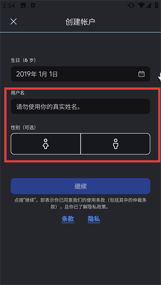 3、在賬戶信息填寫頁面輸入用戶名(請勿使用真實姓名),并可選性別。