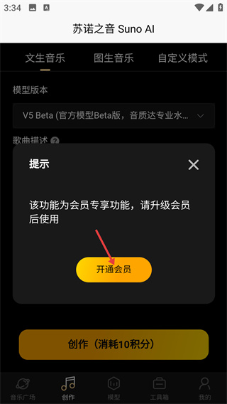 2、在創(chuàng)作頁面選擇模型版本,輸入歌曲描述,按需開啟純音樂選項(xiàng)后點(diǎn)擊【創(chuàng)作(消耗10積分)】。