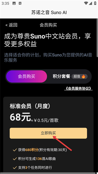4、在會(huì)員購買頁面選擇會(huì)員套餐,點(diǎn)擊【立即購買】完成會(huì)員開通,即可使用會(huì)員專享的音樂創(chuàng)作功能。