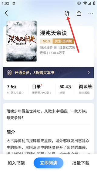 2、在書籍詳情頁,點擊“聽”,進入聽書頁面。