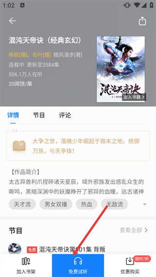 3、在聽書頁面,點擊“免費試聽”,進入播放準備環(huán)節(jié)。