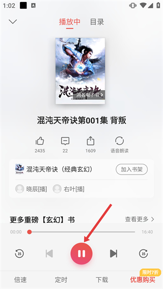 4、進入播放頁面,即可收聽《混沌天帝訣》第001集,可進行播放控制操作。