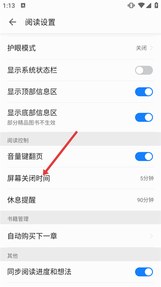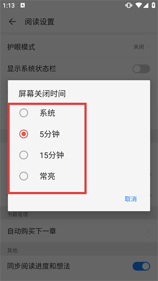 3、在閱讀設(shè)置頁面,點(diǎn)擊【屏幕關(guān)閉時間】,彈出時間選擇窗口。