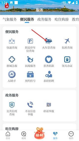 2、在服務(wù)頁(yè)面的便民服務(wù)板塊,點(diǎn)擊【火車票查詢】,進(jìn)入車票查詢頁(yè)面。
