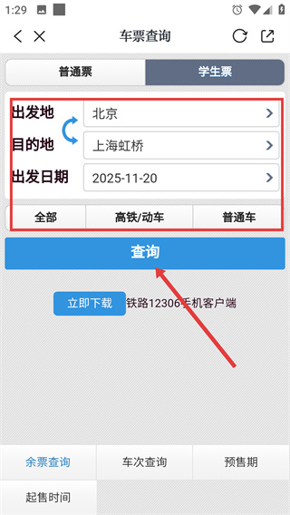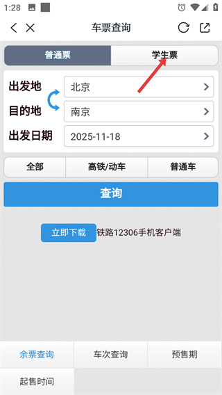 3、在車票查詢頁(yè)面,點(diǎn)擊【學(xué)生票】選項(xiàng),切換到學(xué)生票查詢模式。