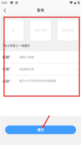 4、在發(fā)布編輯頁面,上傳圖片、填寫標(biāo)題、選擇分類、輸入業(yè)務(wù)內(nèi)容后,點擊【提交】按鈕完成采購發(fā)布。