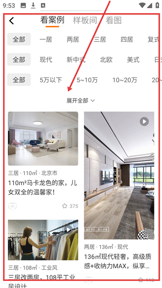2、進(jìn)入看案例頁(yè)面后,可按戶型、風(fēng)格、預(yù)算篩選案例,點(diǎn)擊【展開全部】能看到更多篩選條件哦。