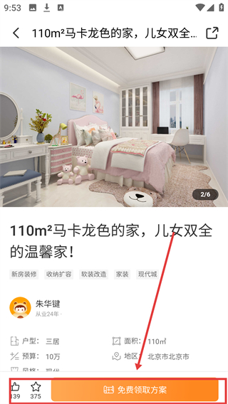 3、選擇心儀的案例進(jìn)入詳情頁(yè)后,點(diǎn)擊【免費(fèi)領(lǐng)取方案】,可獲取該案例對(duì)應(yīng)的裝修方案啦。