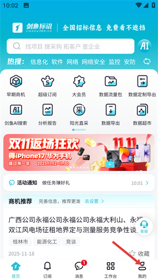 1、打開劍魚標(biāo)訊APP首頁,點擊底部【我的】,進(jìn)入個人中心頁面。