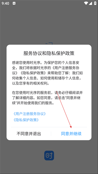 1、使用時光序前,需閱讀【服務(wù)協(xié)議和隱私保護政策】,了解信息收集等內(nèi)容后點擊【同意并繼續(xù)】,方可使用服務(wù)。