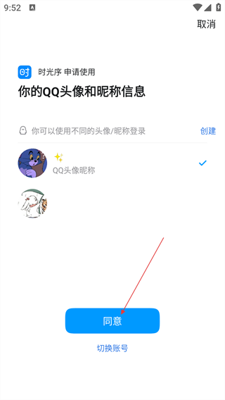 4、時光序申請使用QQ頭像和昵稱信息時,選擇對應(yīng)頭像昵稱后點擊【同意】,即可完成QQ登錄授權(quán)。