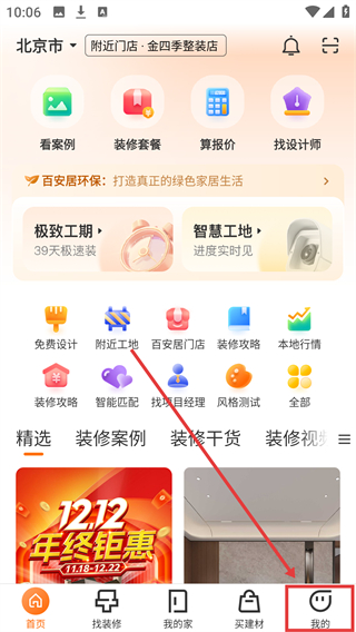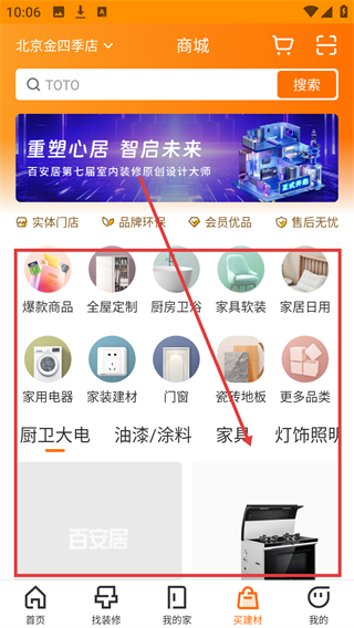 1、在首頁點擊底部【買建材】,進(jìn)入商城界面,準(zhǔn)備挑選裝修相關(guān)商品哦。
