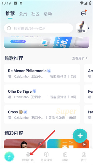 1、在推薦頁面點(diǎn)擊底部【曲譜廣場(chǎng)】按鈕,可進(jìn)入曲譜廣場(chǎng)頁面。
