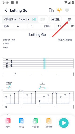 3、在《Letting Go》曲譜播放頁點(diǎn)擊右上角菜單按鈕,可展開功能菜單。