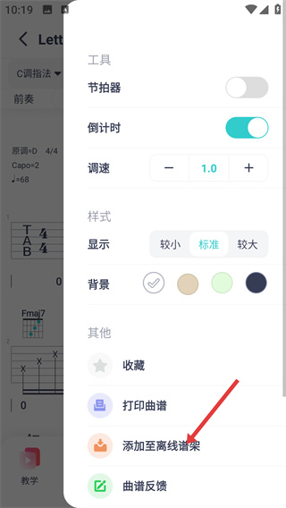 4、在功能菜單中點(diǎn)擊【添加至離線譜架】,可將該曲譜添加到離線譜架中。