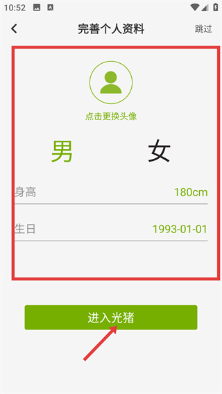 4、在完善個人資料頁面填寫相關(guān)信息后,點擊【進入光豬】按鈕,即可進入光豬圈健身平臺。