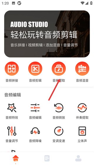 1、在音頻編輯軟件首頁點擊【音頻提取】,進(jìn)入視頻選擇流程。