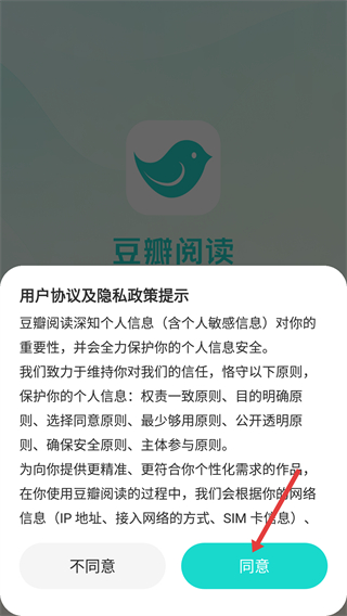 1、在豆瓣閱讀的“用戶協(xié)議及隱私政策提示”彈窗中,點擊【同意】按鈕,完成協(xié)議確認并進入應(yīng)用的登錄界面。