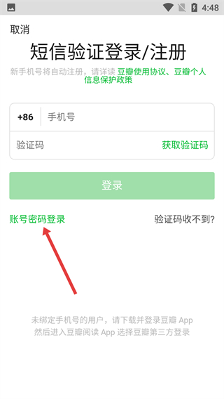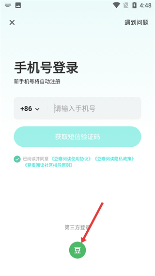 2、在手機號登錄界面,點擊底部的“豆”標識,進入短信驗證登錄/注冊的操作頁面。