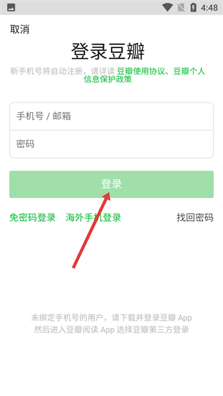 4、在“登錄豆瓣”頁面,輸入綁定的手機號/郵箱及對應(yīng)密碼后,點擊【登錄】按鈕,完成賬號的登錄操作。