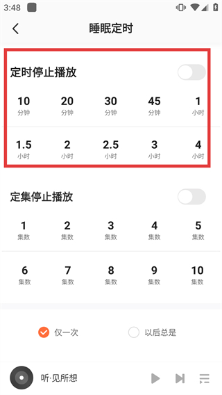 4、在睡眠定時(shí)頁面,可選擇“定時(shí)停止播放”或“定集停止播放”,同時(shí)可選擇“僅一次”或“以后總是”的生效方式,完成播放自動停止的配置。