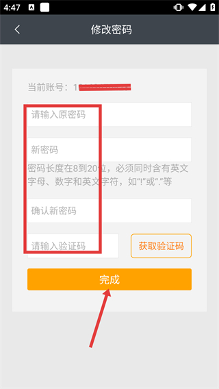 4、在【修改密碼】界面,依次填寫【原密碼】-【新密碼】-【確認(rèn)新密碼】-【驗(yàn)證碼】,完成后點(diǎn)擊【完成】按鈕。