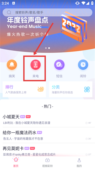 1、在鈴聲APP首頁,點(diǎn)擊【來電】分類選項(xiàng),進(jìn)入來電鈴聲的列表界面,查看可選的鈴聲內(nèi)容。
