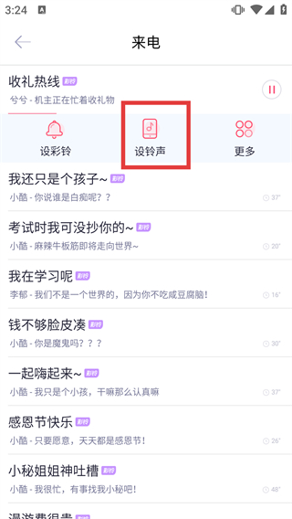 3、在目標(biāo)鈴聲的操作欄中,點(diǎn)擊【設(shè)鈴聲】按鈕,彈出鈴聲的設(shè)置類型選擇菜單。
