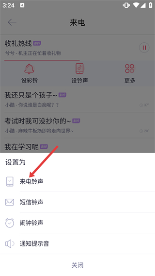 4、在設(shè)置類型菜單中,選擇【來電鈴聲】選項(xiàng),完成該鈴聲作為來電鈴聲的設(shè)置操作。