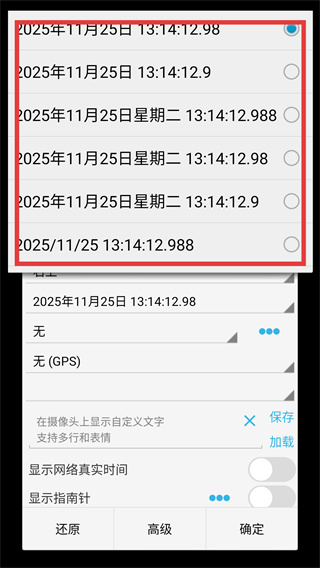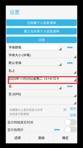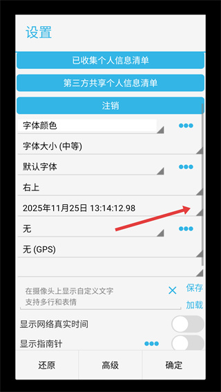 1、拍攝時(shí)自動添加精確到秒的時(shí)間與位置,可自定義格式、地點(diǎn)及字體樣式,自由調(diào)整顯示位置。