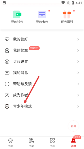 2、在個人中心頁面,找到并點擊【青少年模式】選項,進入該模式對應(yīng)的設(shè)置界面,準備進行模式配置。