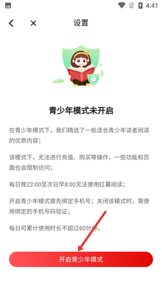 3、進入青少年模式設(shè)置頁,當(dāng)前顯示【青少年模式未開啟】,點擊底部的【開啟青少年模式】按鈕,啟動模式開啟流程。