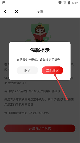 4、觸發(fā)【溫馨提示】彈窗,提示開啟需先綁定手機號,點擊【立即綁定】按鈕,完成手機號綁定以繼續(xù)操作。