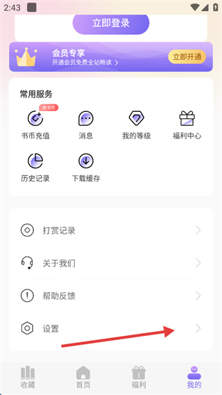 2、進(jìn)入【我的】頁(yè)面后,找到【設(shè)置】選項(xiàng)并點(diǎn)擊,進(jìn)入軟件的設(shè)置功能頁(yè)面。
