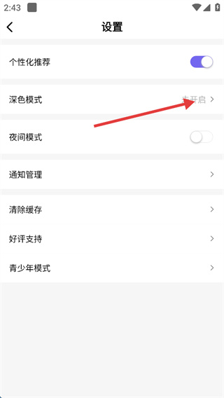 3、在【設(shè)置】頁(yè)面中,點(diǎn)擊【深色模式】選項(xiàng),進(jìn)入對(duì)應(yīng)的模式設(shè)置界面。