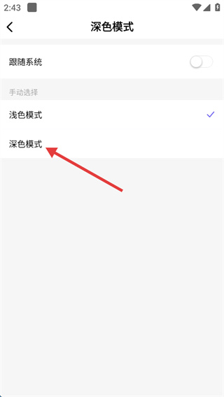 4、進(jìn)入【深色模式】設(shè)置界面后,選擇【深色模式】選項(xiàng),即可完成軟件顯示模式的切換。