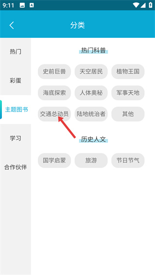 1、在【分類】頁面左側(cè)選中【主題圖書】,在右側(cè)【熱門科普】板塊里點(diǎn)擊【交通總動員】選項,進(jìn)入對應(yīng)分類內(nèi)容。