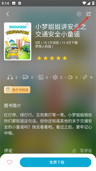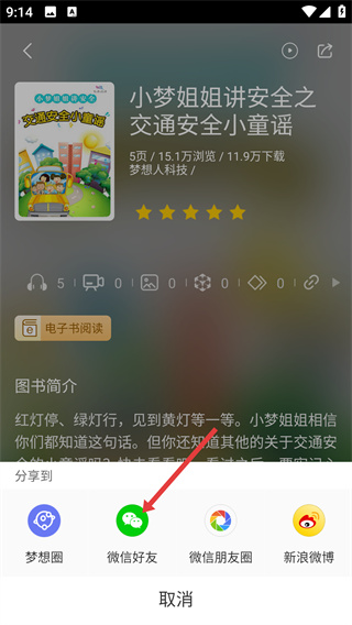 3、進(jìn)入【小夢姐姐講安全之交通安全小童謠】詳情頁,查看內(nèi)容信息后,點(diǎn)擊頁面右上角的【分享】按鈕,調(diào)出分享選項。