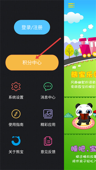 2、在主界面點擊左上角的菜單按鈕,展開功能側邊欄,可查看登錄/注冊、積分中心等各類功能入口。