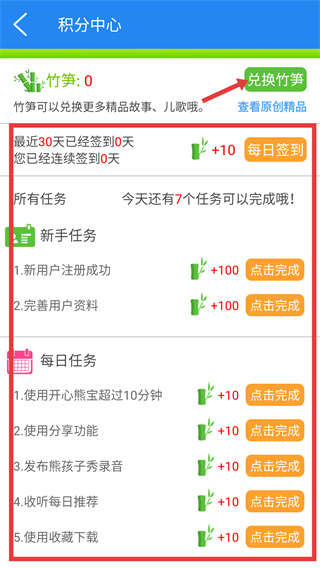 4、進入積分中心頁面,可完成每日簽到、新手任務等獲取【竹筍】,點擊【兌換竹筍】兌換精品內容。