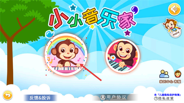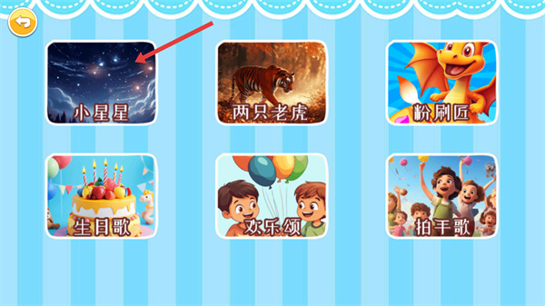 1、在【小小音樂家】界面,選擇對應(yīng)猴子形象的入口,進(jìn)入音樂學(xué)習(xí)的曲目選擇頁面。