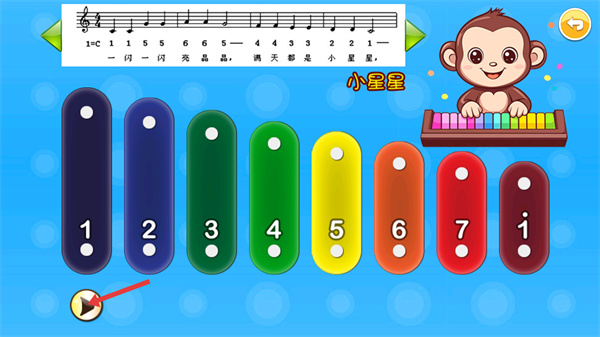 3、在【小星星】演奏界面,點(diǎn)擊左下角播放按鈕,可收聽曲目示范音頻,輔助學(xué)習(xí)演奏。